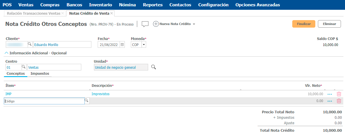 - Para terminar el proceso de la nota crédito por otros conceptos da clic en el botón Finalizar.