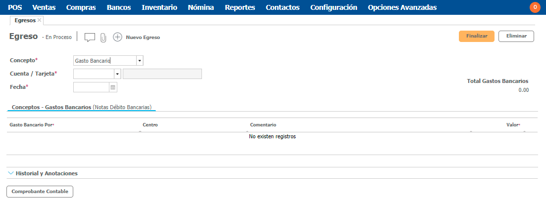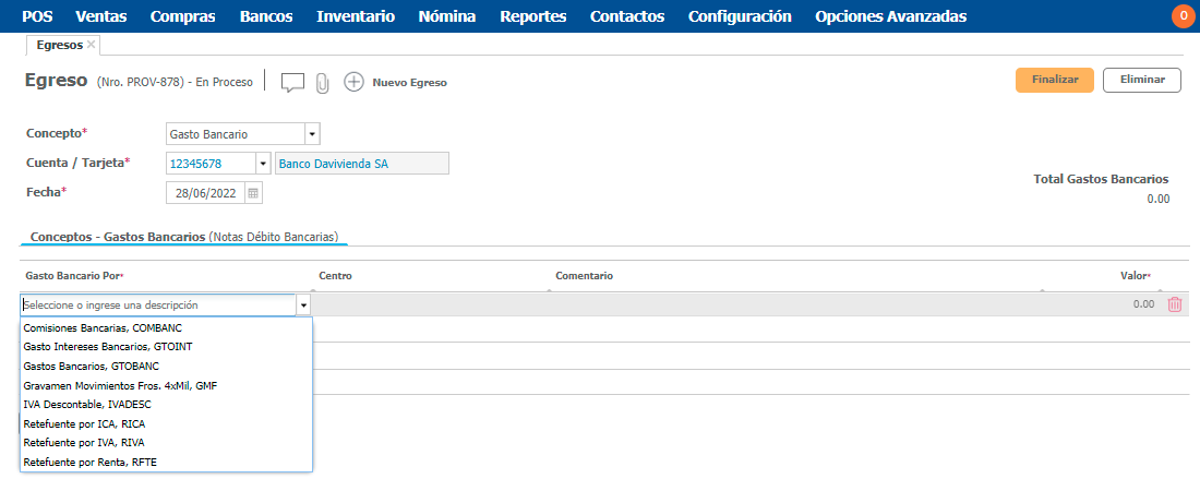 Luego de diligenciar los campos requeridos puedes proceder a Finalizar el egreso de dinero por gasto bancario.