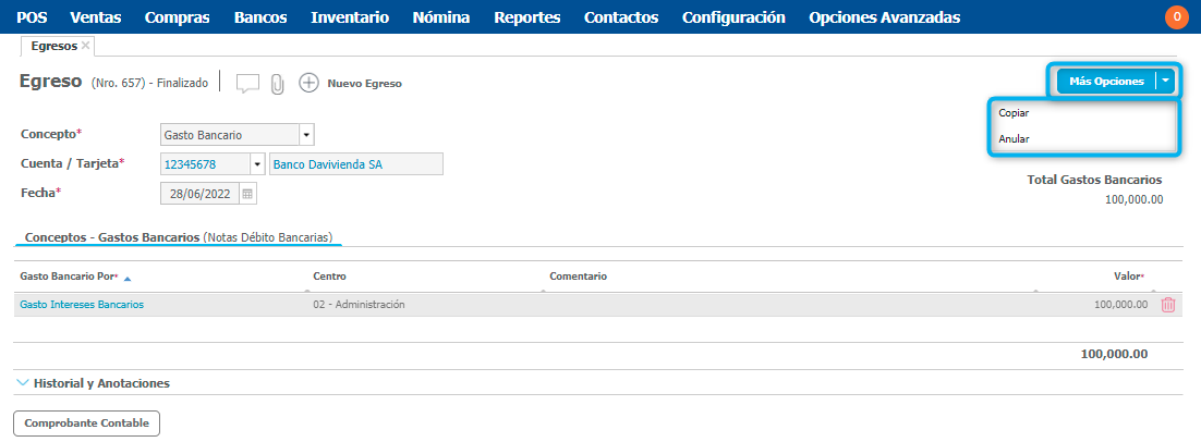 - Copiar: Tienes la posibilidad de crear un nuevo egreso por gastos bancarios con estado en proceso que contenga la información del original, sobre este nuevo egreso puedes realizar las modificaciones que requieras antes de finalizarlo. Ten en cuenta que se copiaran aquellos conceptos y cuentas que estén activos.