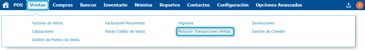 Para iniciar el proceso de importar ingresos de dinero debes dirigirte a Ventas → Relación Transacciones Ventas
