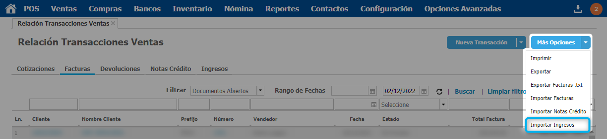 Allí despliegas el botón de Más Opciones y das clic en Importar Ingresos.