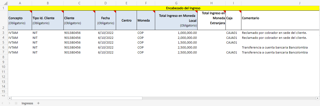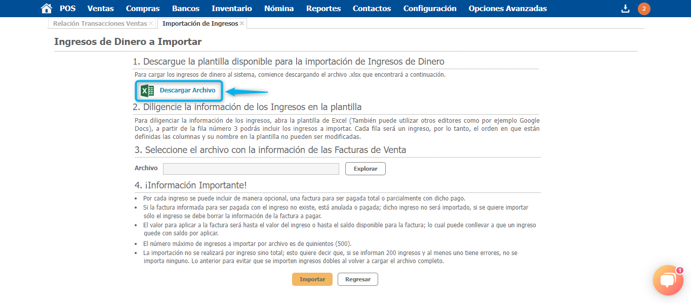 Tienes la posibilidad de importar en el sistema ingresos de dinero (por concepto de pago de clientes),con ayuda de una plantilla de excel que te proporcionamos. Adicional, podrás indicar si deseas que con este se pague alguna factura de venta.