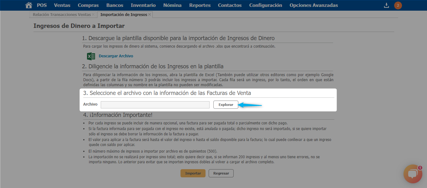 Para importar el archivo debes volver nuevamente a la opción de Importar Ingresos desde la Relación Transacciones Ventas.