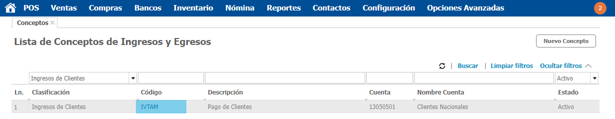 Estos códigos hacen referencia a los conceptos que se tengan configurados en el sistema con clasificación ingreso de clientes.
