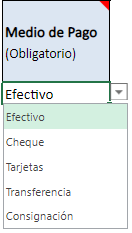 Medio de Pago*: Da clic en este campo y desde el menú desplegable selecciona el medio por el cual se hizo el pago del dinero.