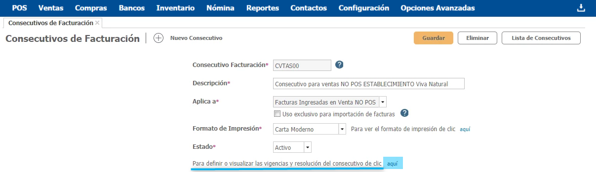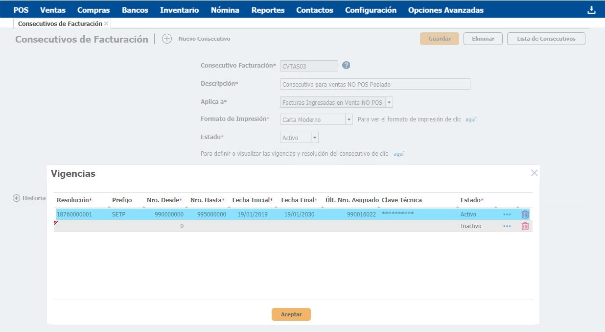 Ingresa a Configuración → Consecutivos de Facturación, si el consecutivo ya se encuentra creado debes dar clic en el código (en color azul) que corresponde.