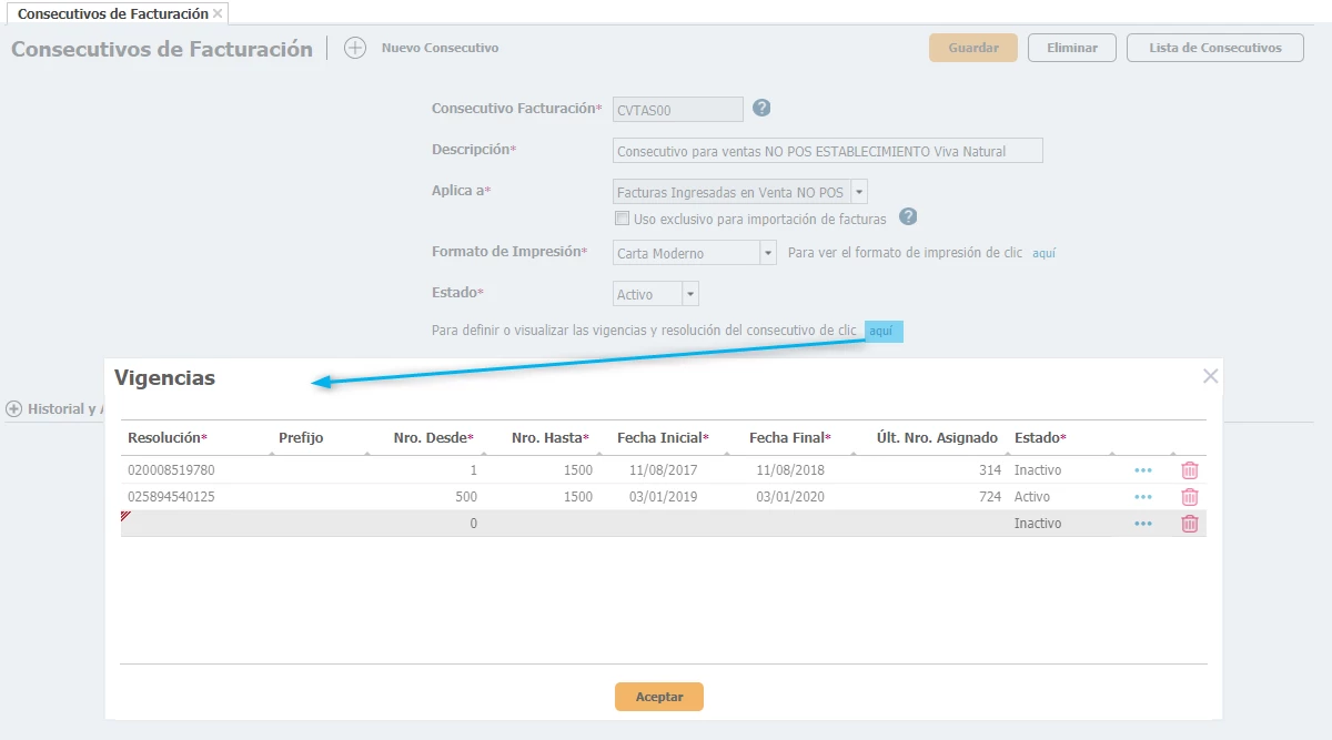 Para continuar ubica la opción: "Para definir o visualizar las vigencias y resolución del consecutivo de clic"