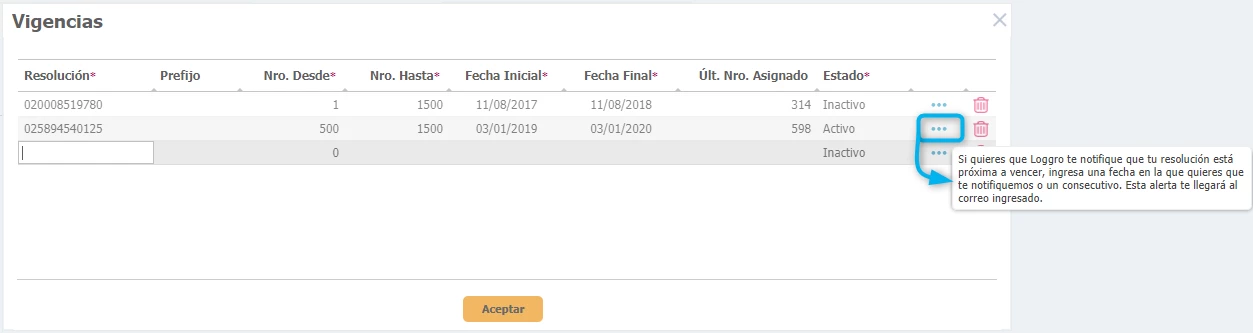 donde puedes definir si quieres que Loggro te notifique cuando se va a dar el vencimiento de la resolución respectiva.