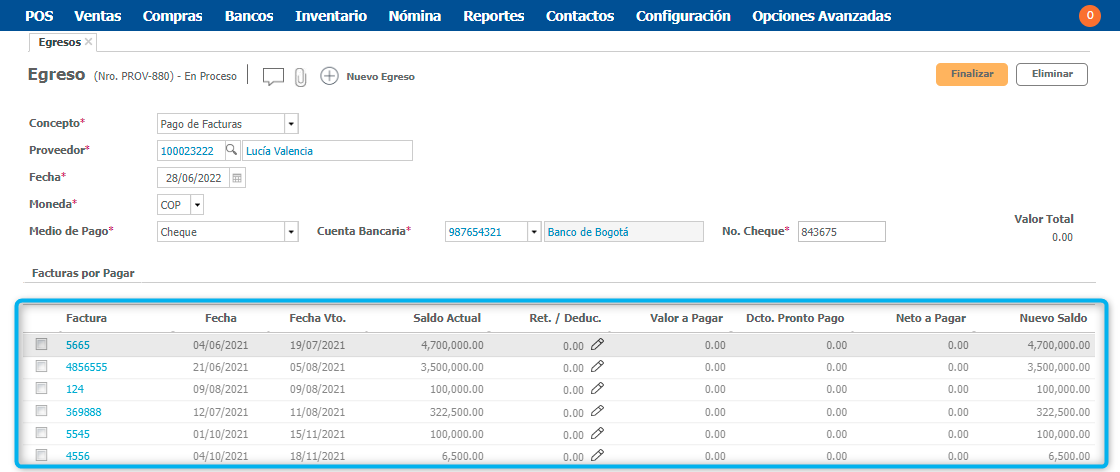 En el ejemplo anterior, el proveedor seleccionado cuenta con varias facturas pendientes de pago. El proceso a realizar es el siguiente: