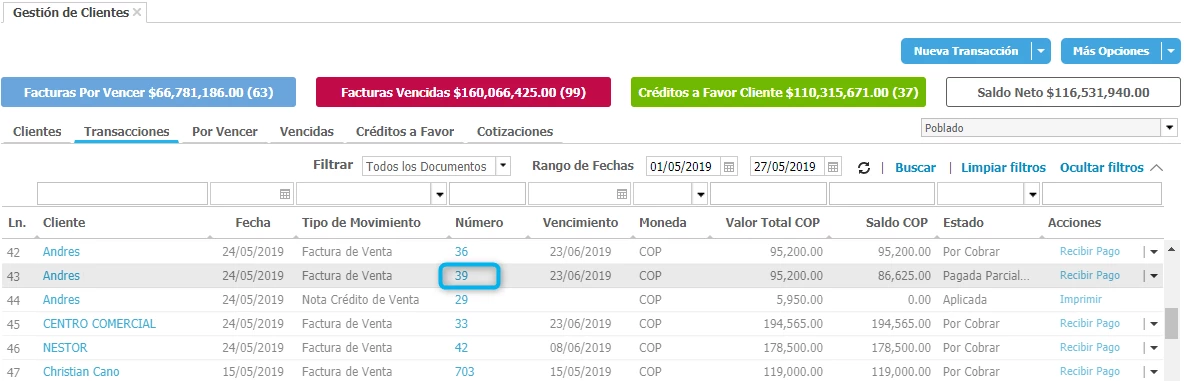 - Ventas → Gestión de Clientes: Al abrir la ventana a través de la pestaña de transacciones o en las pestañas de vencimiento de las facturas, podrás consultar las facturas y navegar directamente a ellas, haciendo clic en el número de color azul para cada uno de los documentos.