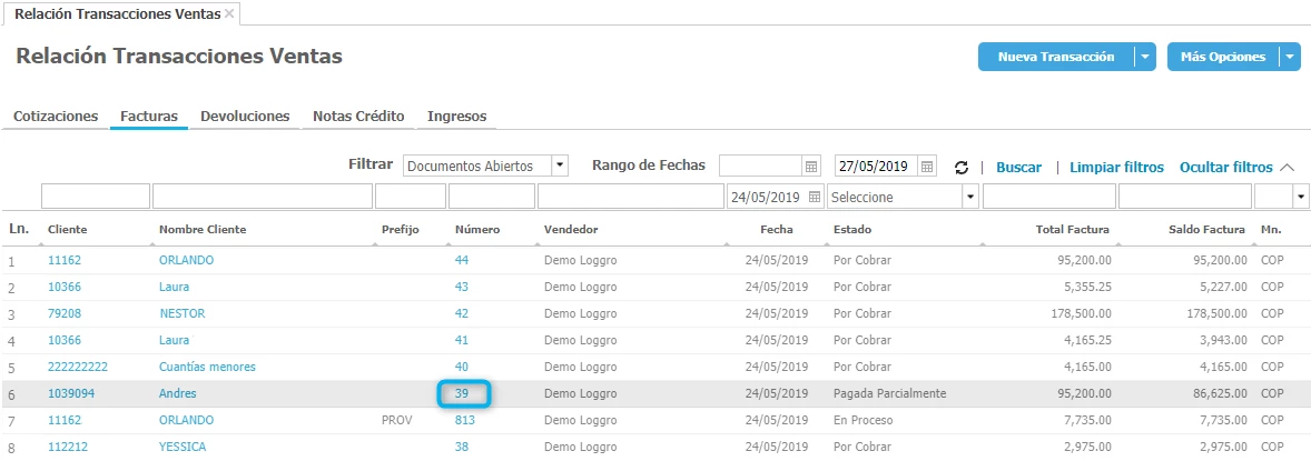 Para acceder a la factura de venta das clic en el número del documento que se muestra en color azul.