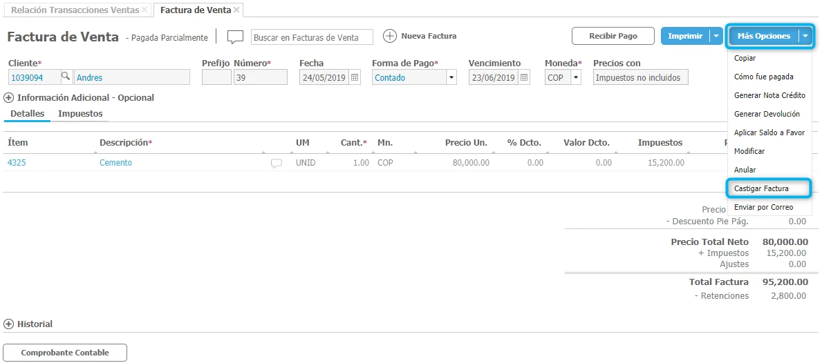 Al abrir la factura de venta debe dar clic en el botón “Más opciones” podrás seleccionar la opción de Castigar Factura, siempre y cuando esta se encuentre en estado por cobrar o pagada parcialmente.