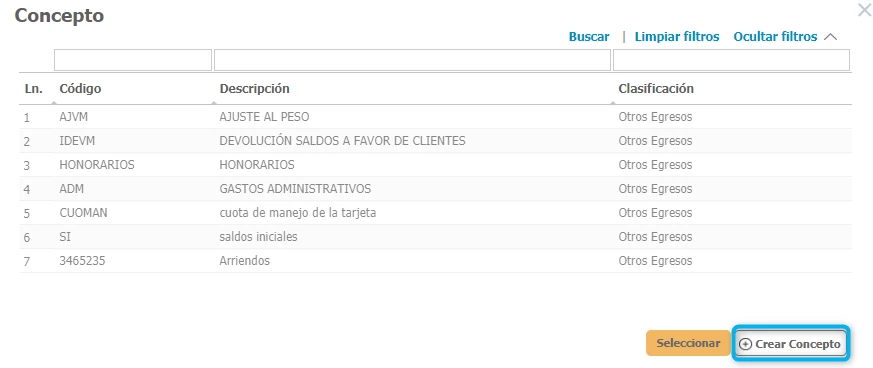 En el icono de la lupa en el campo de Concepto puedes definir uno ya creado o crear uno nuevo.
