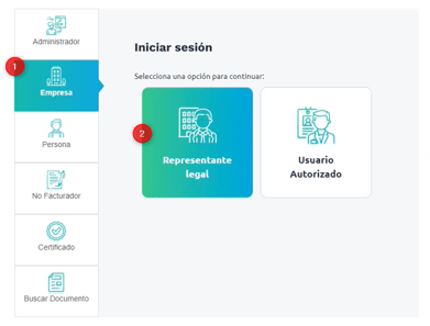 Debes realizar el ingreso como Empresa o Persona según aplique. En el siguiente ejemplo realizamos el ingreso como Empresa y posteriormente seleccionamos Representante Legal