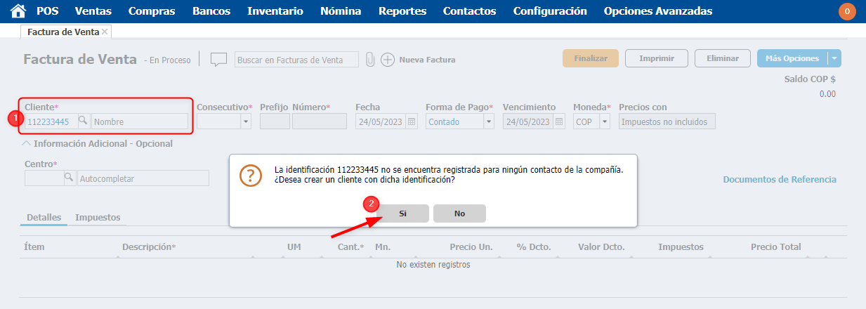 Al continuar, el sistema muestra un mensaje donde se sugiere la creación rápida del cliente. Da clic en Si ② y se abrirá una nueva ventana donde debes diligenciar los datos básicos del cliente.