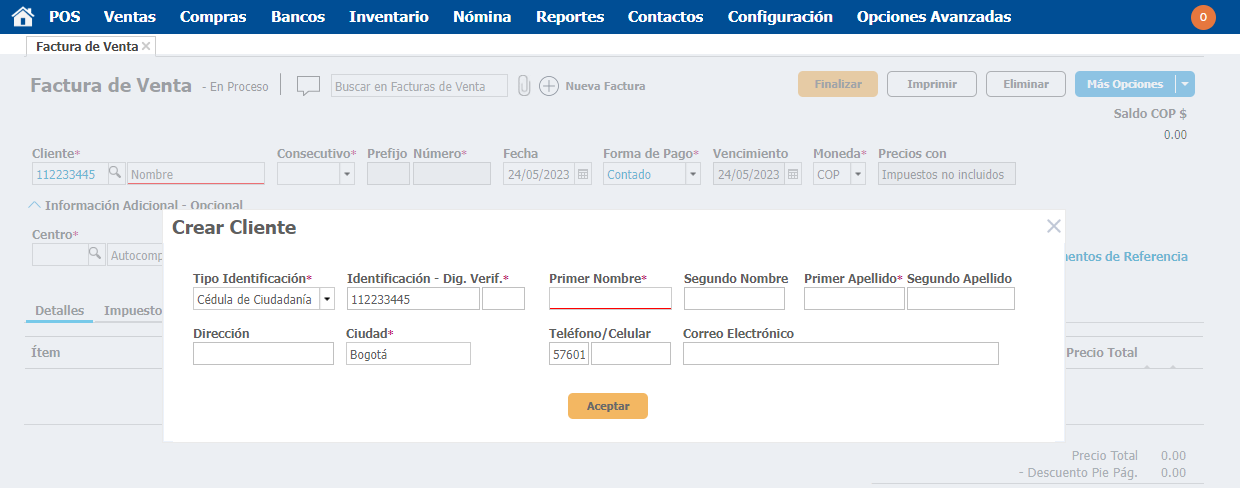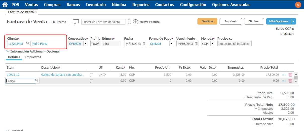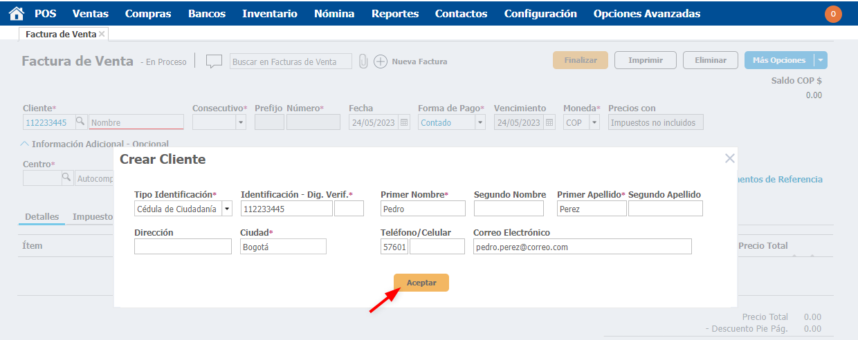 Con esto se toma la información del cliente y podrás continuar tramitando la factura de venta.
