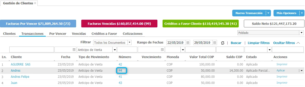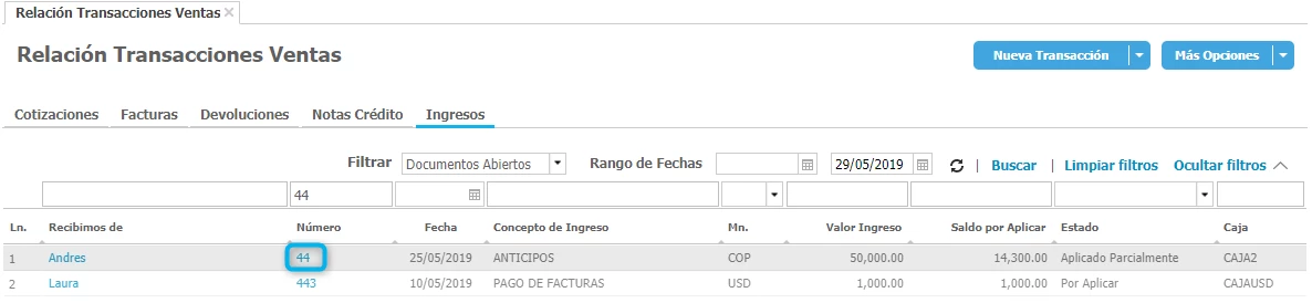 1. Ventas → Gestión de Clientes: Al abrir la ventana, a través de la pestaña de transacciones o en las pestañas de vencimiento de los documentos podrás consultar los ingresos de dinero y navegar directamente a ellos, haciendo clic en el número de color azul para cada uno de los documentos.