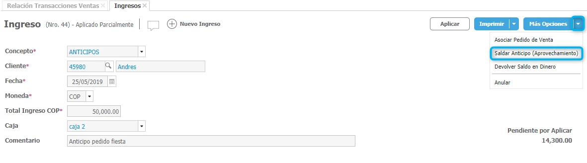 Al abrir el ingreso de dinero debe dar clic en el botón “Más opciones” podrás seleccionar la opción de Saldar Anticipo (Aprovechamiento), siempre y cuando esta se encuentre en estado Por Aplicar o Aplicado Parcialmente.