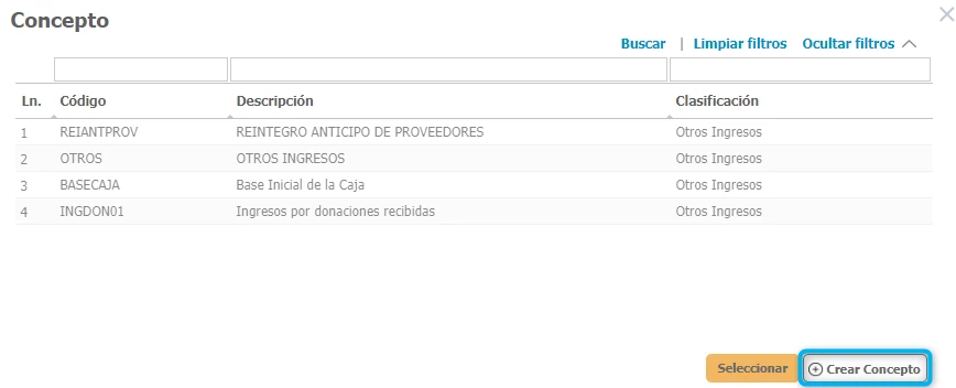En el icono de la lupa en el campo de Concepto puedes definir uno ya creado o crear uno nuevo.