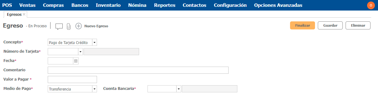 Luego de diligenciar los campos requeridos puedes proceder a Finalizar el egreso de dinero pago de tarjeta de crédito. El egreso queda aplicado de forma automática e inmediatamente te genera la salida de dinero de caja o banco.