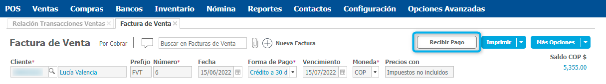 Al abrir la factura de venta, puedes visualizar la opción de Recibir Pago en la parte superior derecha del documento. Esta te permite registrar el pago que realizó el cliente directamente sobre la factura generada