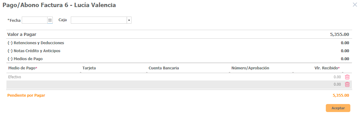 Al dar clic en el botón Recibir Pago, el sistema te abre una nueva ventana donde podrás diligenciar el mismo. Inicialmente debes indicar la Fecha en la cual se realizó el pago y la Caja con la cual se relacionará este.