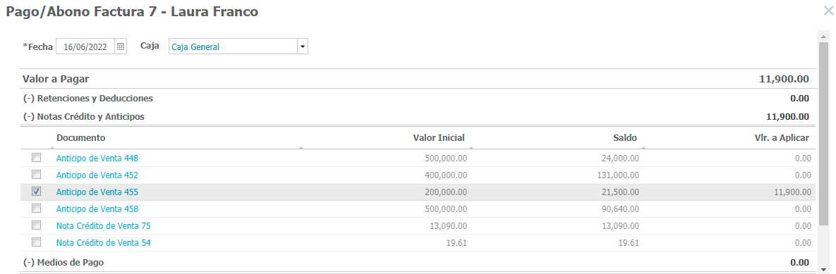Al desplegar la sección de Notas Crédito y Anticipos, se listaran todos los saldos que tiene a favor el cliente y podrás elegir cual deseas aplicar seleccionando la casilla de verificación