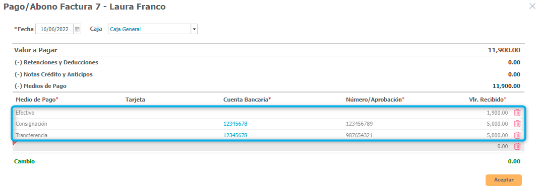 Loggro te muestra el acumulado de los diferentes medios de pagos al igual que el cambio (valor a devolver) en caso de tener parte de pago en efectivo.