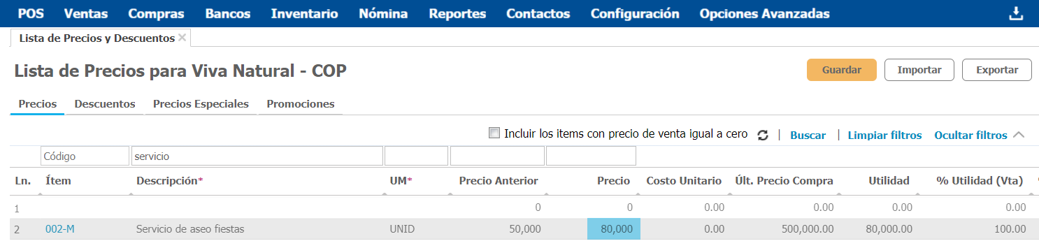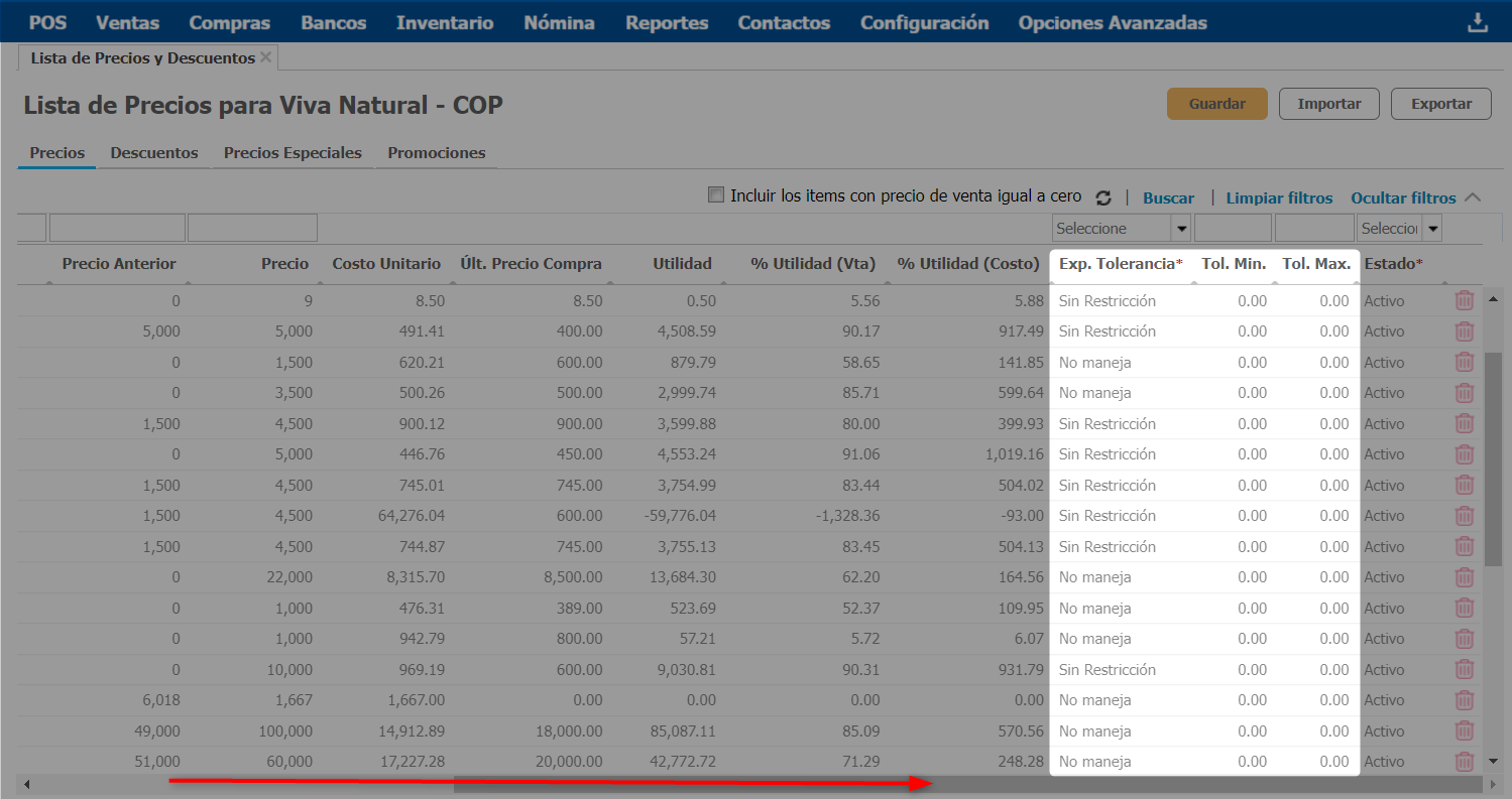 Recuerda que en la opción de Configuración → Lista de Precios y Descuentos, desde la pestaña de Precios puedes establecer que tan flexible es la modificación del precio de un producto/servicio en la venta, es decir la Expresión de Tolerancia.