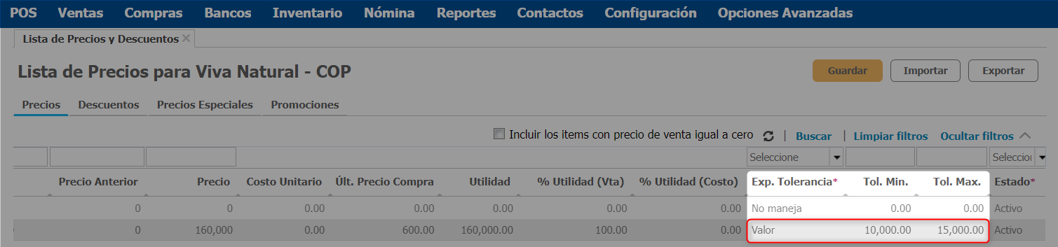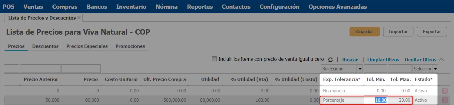 Valor: Al establecer la tolerancia por Valor, el nuevo precio que se establezca en la venta no puede exceder el valor de la tolerancia máxima ni ser menor al definido en tolerancia mínima. Estos dos valores se toman en base al precio de venta que posee el ítem.Para modificar los campos de Tol. Min y Tol. Max en los casos que aplica solo debes dar clic y estos se activan automáticamente.