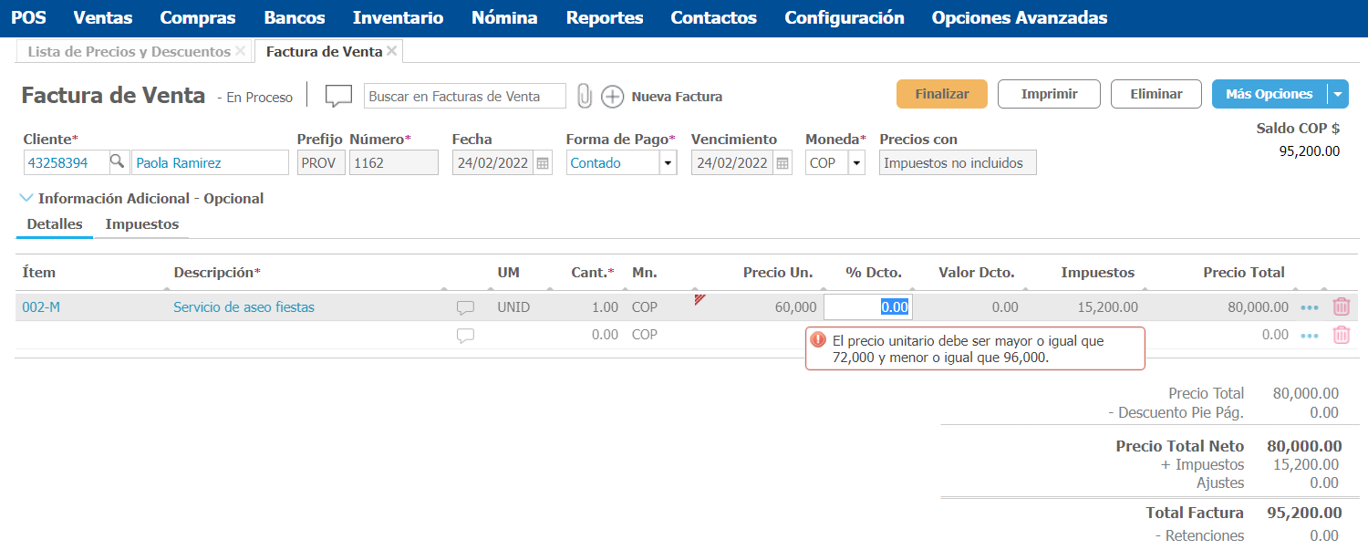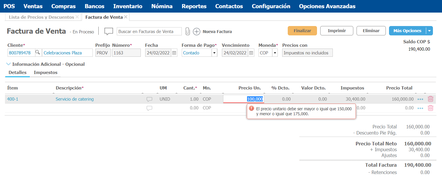 Al realizar la factura de venta y establecer un precio de venta que no esté en este rango podemos visualizar el mensaje de error.