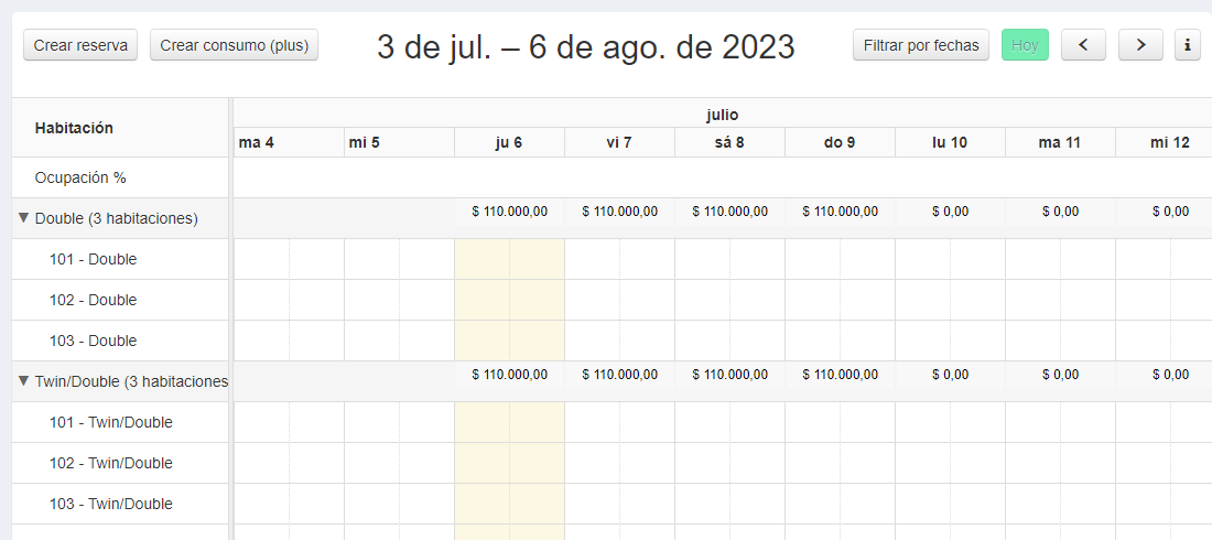 Para cambiar el Plan Tarifario solo debes ingresar al PMS, en la pestaña Inicio Calendario puedes visualizar tus habitaciones por tipo (Sencilla, doble, twin, triple, etc), y a su vez una columna con las fechas del mes.