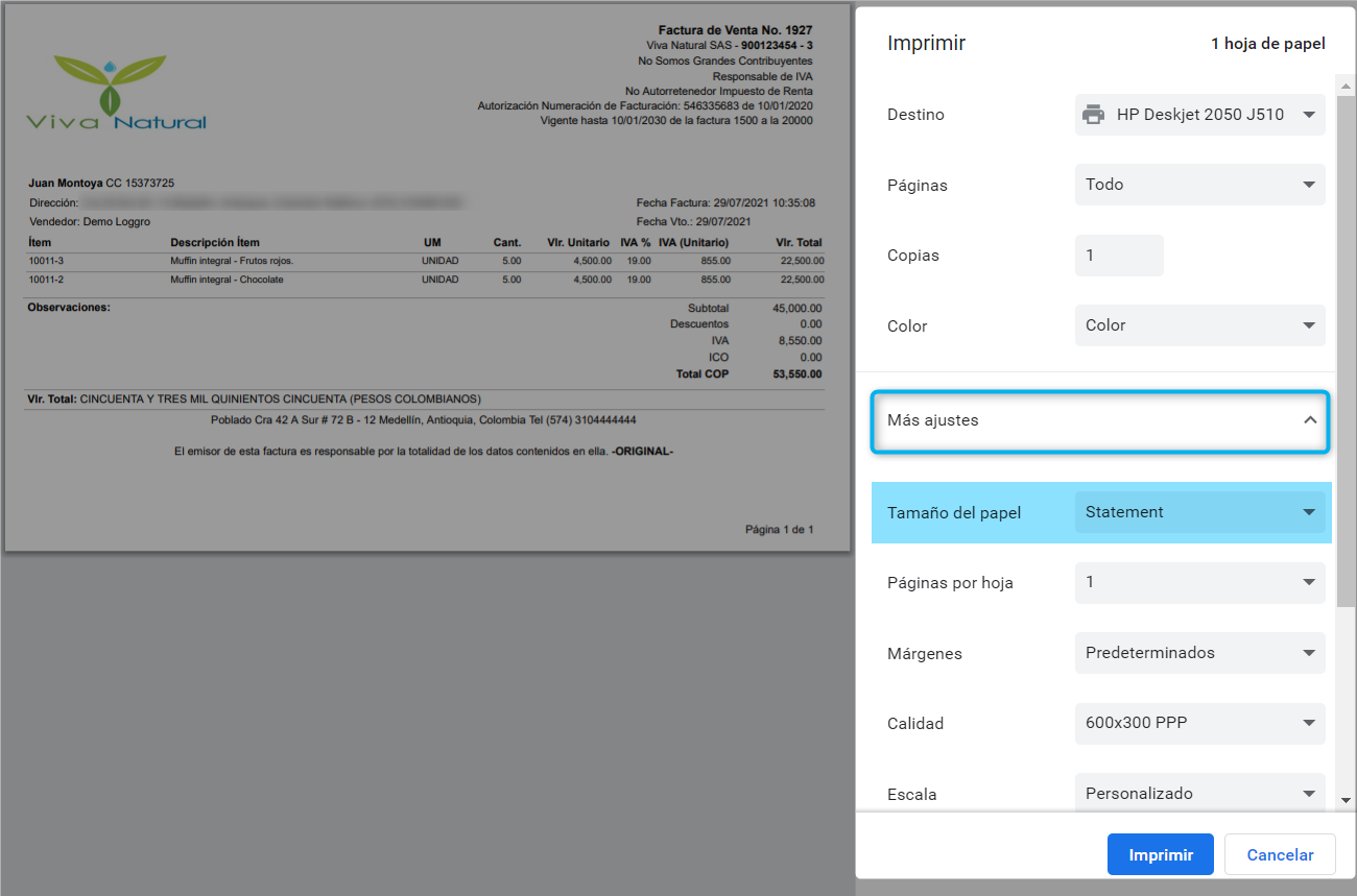 - Al imprimir el documento garantices que el tamaño del papel sea Statement o cumpla con las medidas 148 X 210mm. Esta información la puedes verificar en la vista previa de impresión, desplegando la opción de Más ajustes.