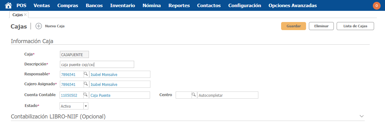 - Iniciamos con la creación de una caja, esta será utilizada como puente para realizar el cruce de las facturas. Para validar cómo crear una nueva caja puedes dar clic aquí.