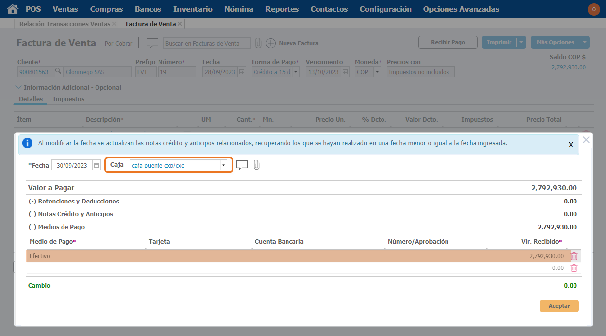 - Una vez tenemos creada la caja, procedemos con el cruce de las facturas. Iniciamos con la factura de venta, vamos a ingresar a esta y procedemos a recibir el pago, el cual se debe generar en efectivo y el ingreso lo realizamos a la caja que creamos anteriormente.