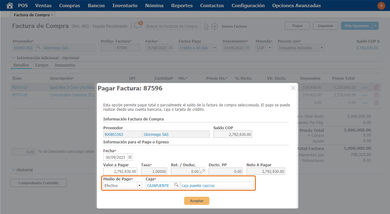 - Luego procedemos a realizar el pago en la factura de compra. Vamos a abrirla y realizaremos el proceso, seleccionando la misma caja del ingreso.