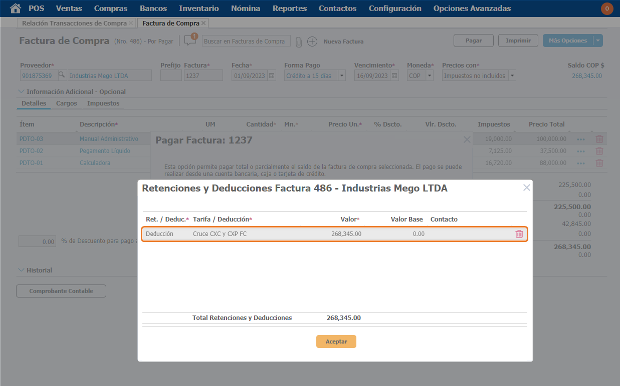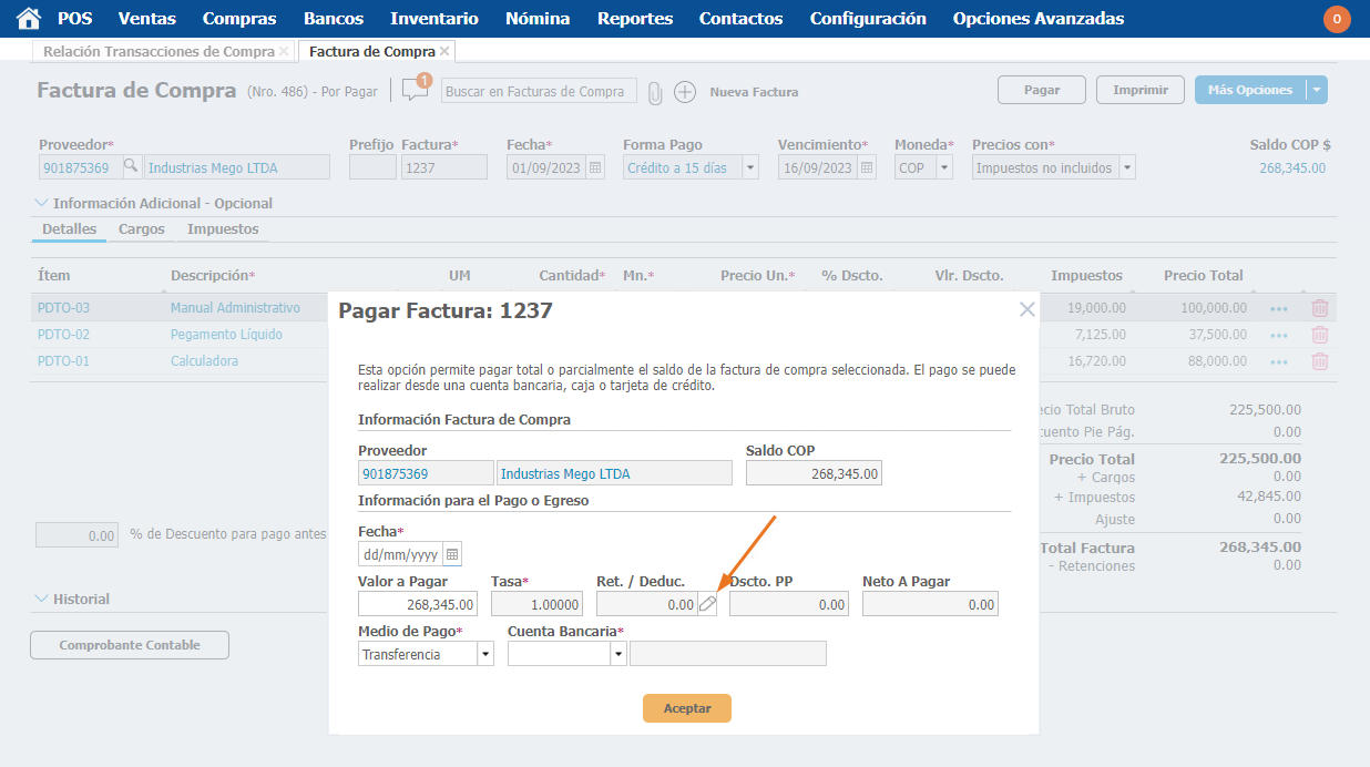- Proceso en la Factura de Compra: Al ingresar a la factura, debes dar clic en Pagar. El sistema habilita una nueva ventana y allí debes dar clic en el lápiz del campo Ret / Deduc.