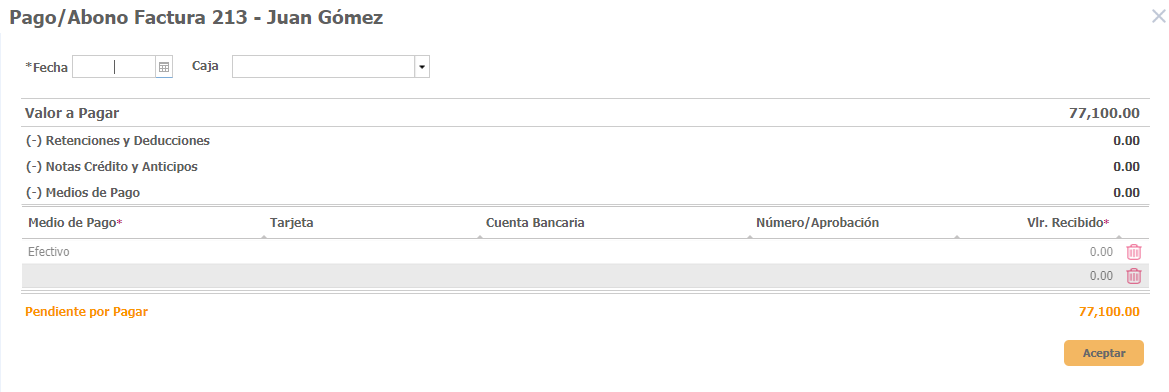 - En la nueva ventana diligencia los campos requeridos (fecha, caja, medios de pago y valor recibido).