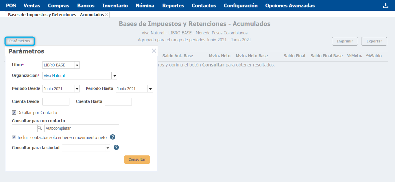 Para acceder al informe da clic en: Reportes → Auxiliar de Bases de Impuestos y Retenciones - Acumulados