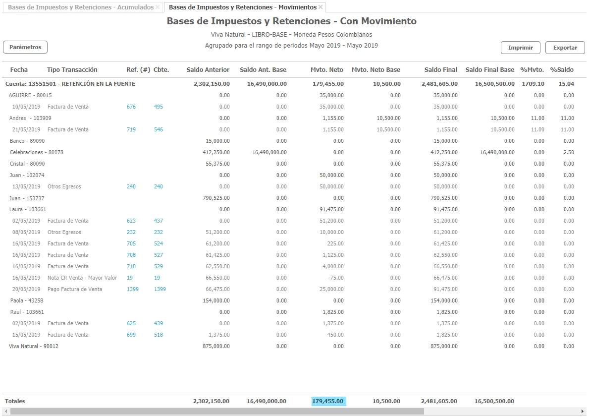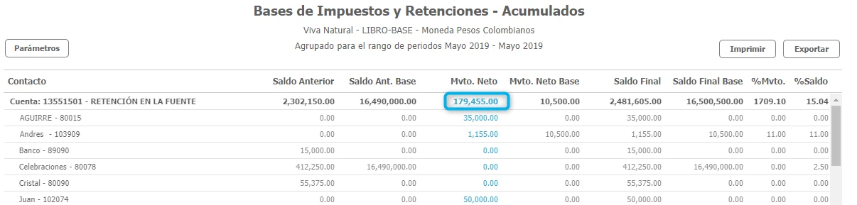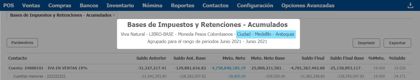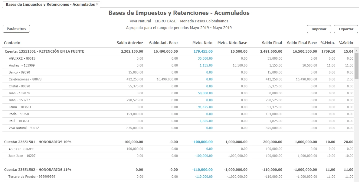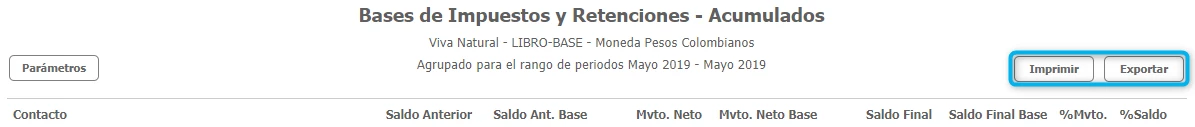 Es un reporte contable que muestra las bases de impuestos y retenciones aplicados en tu compañía de forma global, allí se relaciona la cuenta contable, el tercero y el valor respectivo.