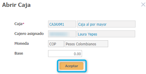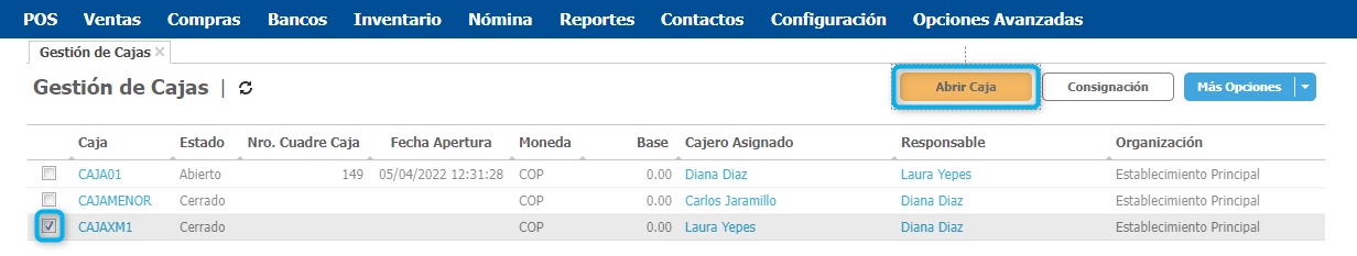 - Selecciona una de las cajas creadas y da clic en el botón Abrir Caja. Recuerda que los únicos que pueden abrir las cajas son los asignados y responsables de cada una.