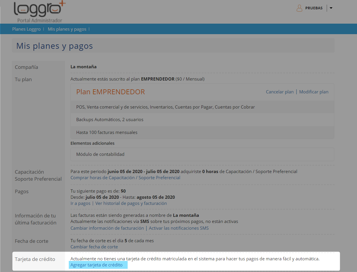 Desde el Portal Administrativo tienes la posibilidad de adicionar una tarjeta de crédito y activar desde esta el débito automático para el pago del sistema.