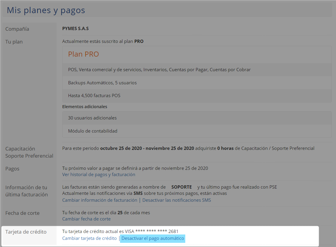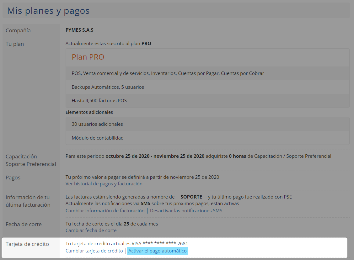 Al seleccionar el campo Si y Guardar los cambios ya queda finalizada la configuración y de forma automática se realizará el descuento por el valor mensual del plan adquirido.