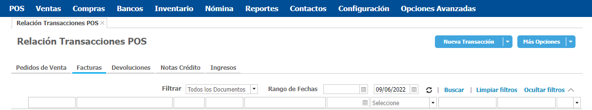 Ingresa al módulo de POS en la opción Relación Transacciones POS. En la nueva pestaña da clic en Facturas. Recuerda que puedes utilizar los filtros para encontrar el documento más fácilmente, te recomendamos filtrar siempre por Todos los Documentos.