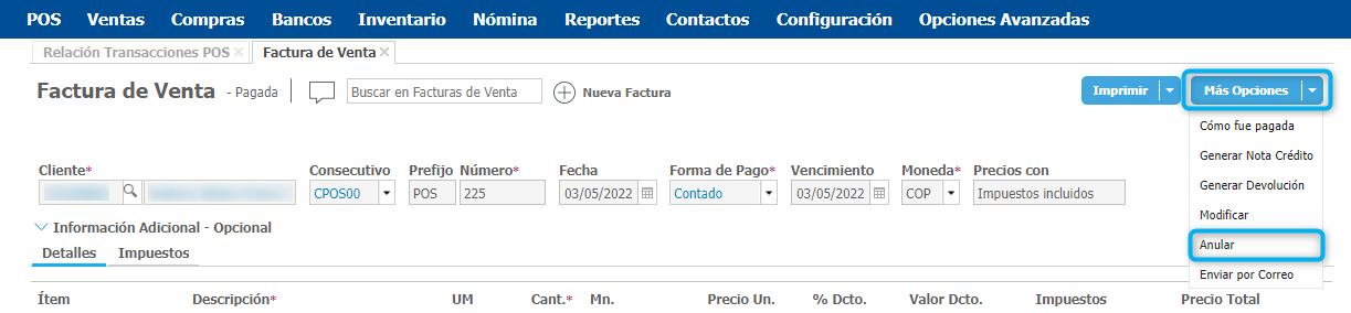 En la ventana Factura de Venta puedes ver toda la información de la transacción. En la parte superior derecha da clic en el botón Más Opciones → Anular