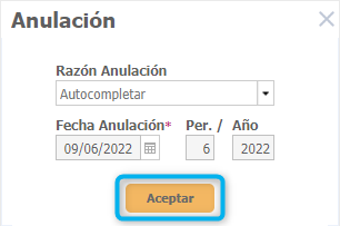 En la ventana emergente selecciona el motivo o Razón de la anulación. La fecha del proceso será automáticamente la actual. Para finalizar da clic en Aceptar.