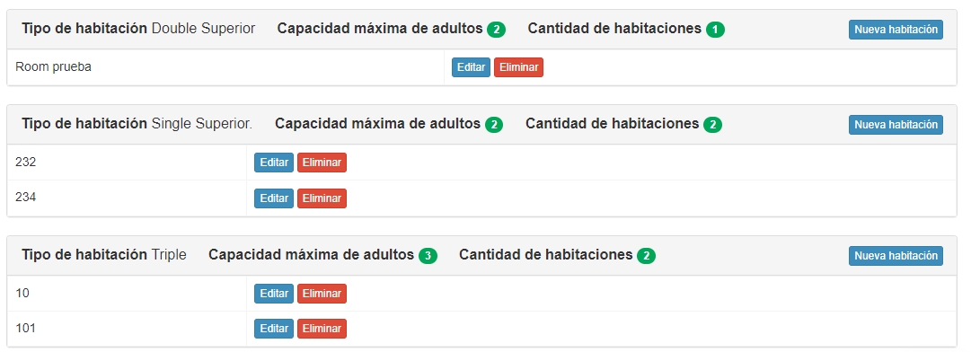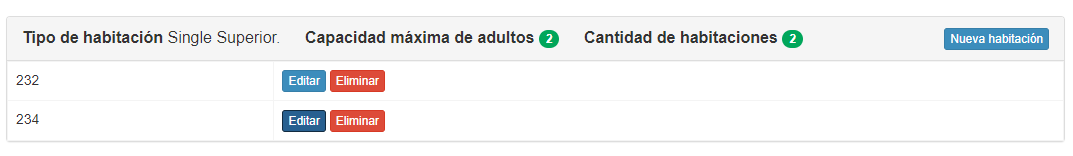 Allí encuentras todos los tipos de habitación que tiene tu propiedad y a su vez las habitaciones que están registradas dentro de cada tipo de habitación.