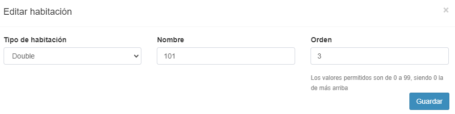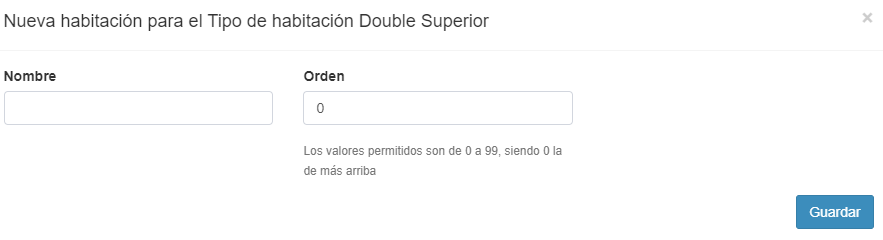 Con esto, se habilita una pestaña donde debes ingresar el Nombre de la habitación y el Orden; este orden habla de la ubicación en donde deseas ver la habitación en el calendario; es decir si lo quieres ver en el puesto 1,2,3... Posterior das clic en Guardar y tu habitación ya queda creada.