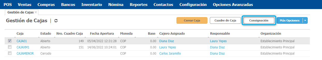 - Selecciona la caja desde la cual vas a realizar la consignación y da clic en Consignación.