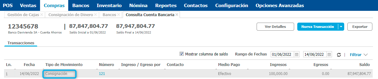 - Ingresa al módulo de Bancos y da clic en el número de la cuenta a la cual le consignaste el dinero.
